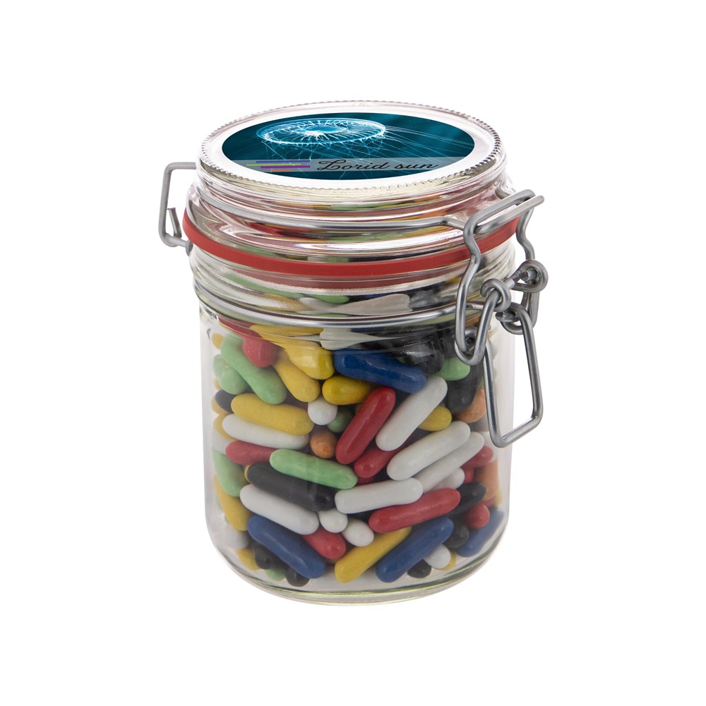 Weckpotje 0,4 liter gevuld met ca. 140 gram Metallic sweets en voorzien van een full colour...meer