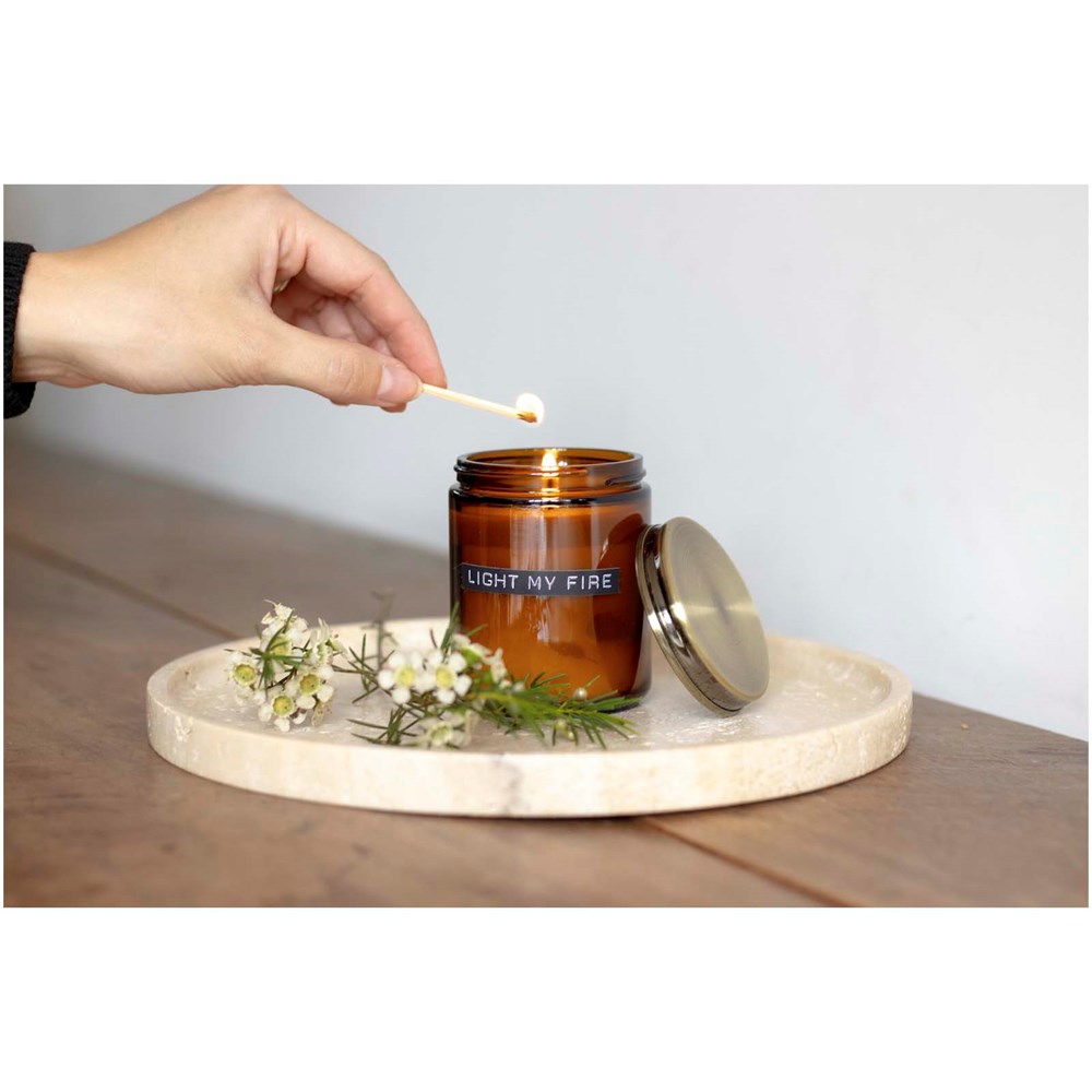 Een middelgrote geurkaars van cederhout in een bruin glas met een messing deksel. De geurkaars brandt tot 35 uur en kan hergebruikt worden om wattenschijfjes in te bewaren of om een schattige minicactus te planten. Het product is handgemaakt in Nederland van 100% koolzaadwas. Geleverd in een katoenen zakje. Het label op de glazen pot kan variëren.