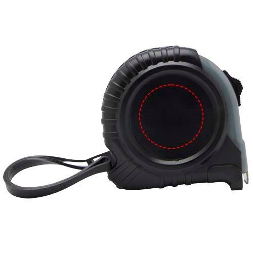 5 meter rolmaat met weergave in centimeters en inches, voorzien van een handige riemclip voor gemakkelijk meenemen.