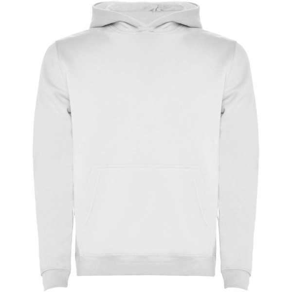 Tweekleurige hoodie met dubbele stof. Versterkte bedekte naden in de kraag en kangoeroezak. 1x1 elastaan rib in manchetten en tailleband. Verwijderbaar etiket. Het model is 120 cm en draagt maat 5/6.