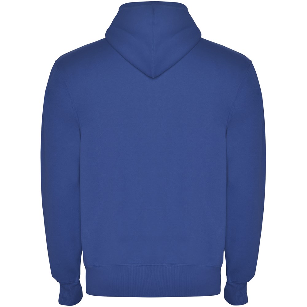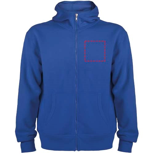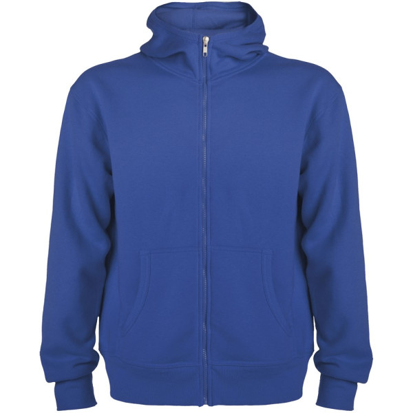 Sweatjack met capuchon, hostaande kraag en volledige rits. Geribbeld detail in capuchon en zakbies. Kangoeroezak. 2x2 ribboord aan manchetten en taille. Verwijderbaar etiket. Het model is 184 cm en draagt maat L.